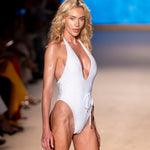 Front view of model wearing white halter neck Selena onepiece swimsuit by Aventura Swimwear.