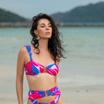 Front view of model wearing pink and purple Tropical Dusk print Seraphina bralette bikini top and matching high waist cheeky cut Seraphina bikini bottom by Aventura Swimwear.