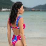 Side view of model wearing pink and purple Tropical Dusk print Seraphina bralette bikini top and matching high waist cheeky cut Seraphina bikini bottom by Aventura Swimwear.